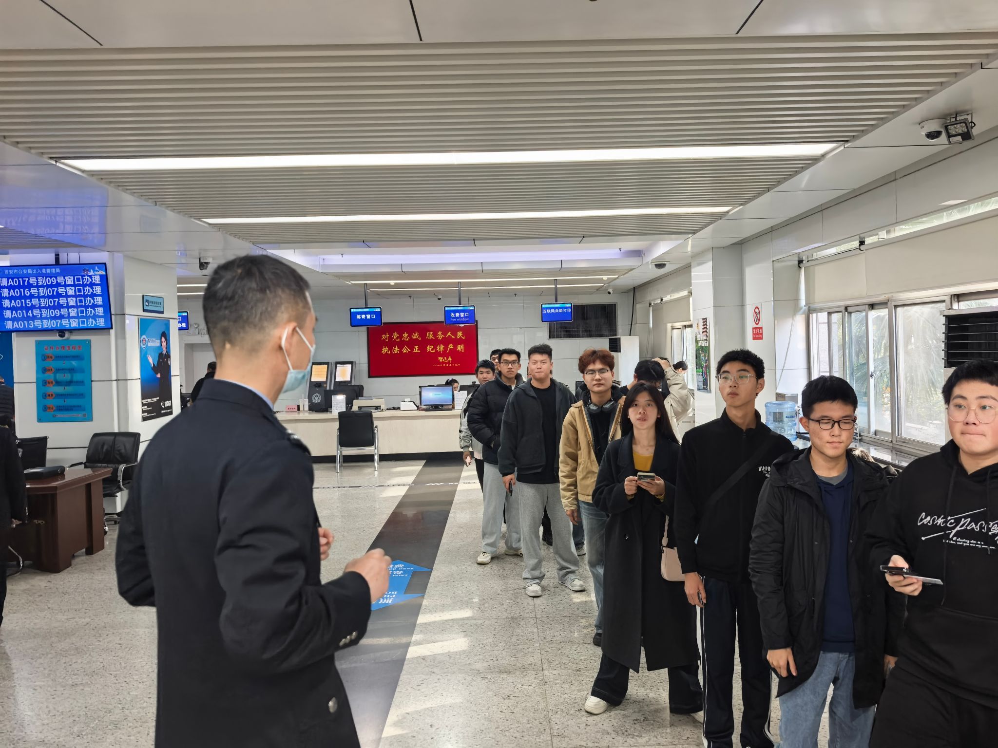 10月30日下午,第一批18名学生准时在指定地点集合,乘坐校车前往高新分局。在派出所工作人员的引导下,同学们有序完成人像采集、申请表打印、材料递交等流程,全程高效快捷,安全返校。11月15日,学院推进第二批服务,组织 27 名学生前往西安市公安局办理护照。在工作人员和志愿者的指引下,学生们顺利完成信息采集核验、缴费登记等全部手续,整场活动规范有序。