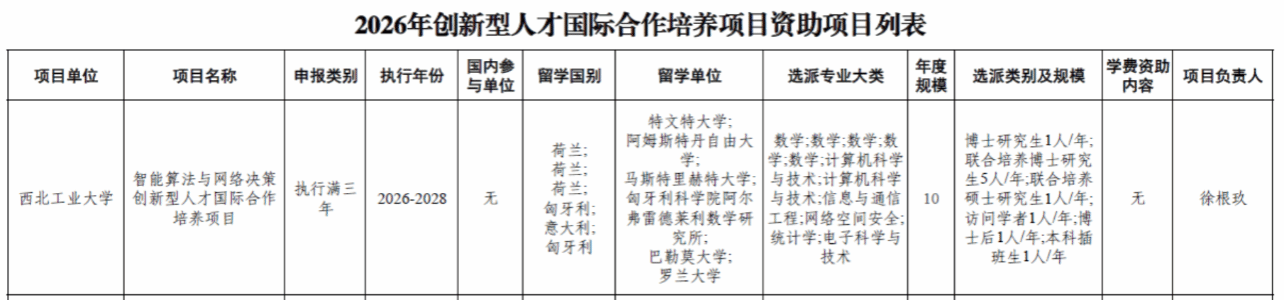 近日,国家留学基金管理委员会公布 2026 年度创新型人才国际合作培养项目立项名单,我院牵头申报的 “智能算法与网络决策创新型人才国际合作培养项目(2026-2028)” 成功获批。这是学院继 2020-2022 年、2023-2025 年连续两次立项后,再度获批国家留学基金委创新型人才国际合作培养项目的滚动支持。