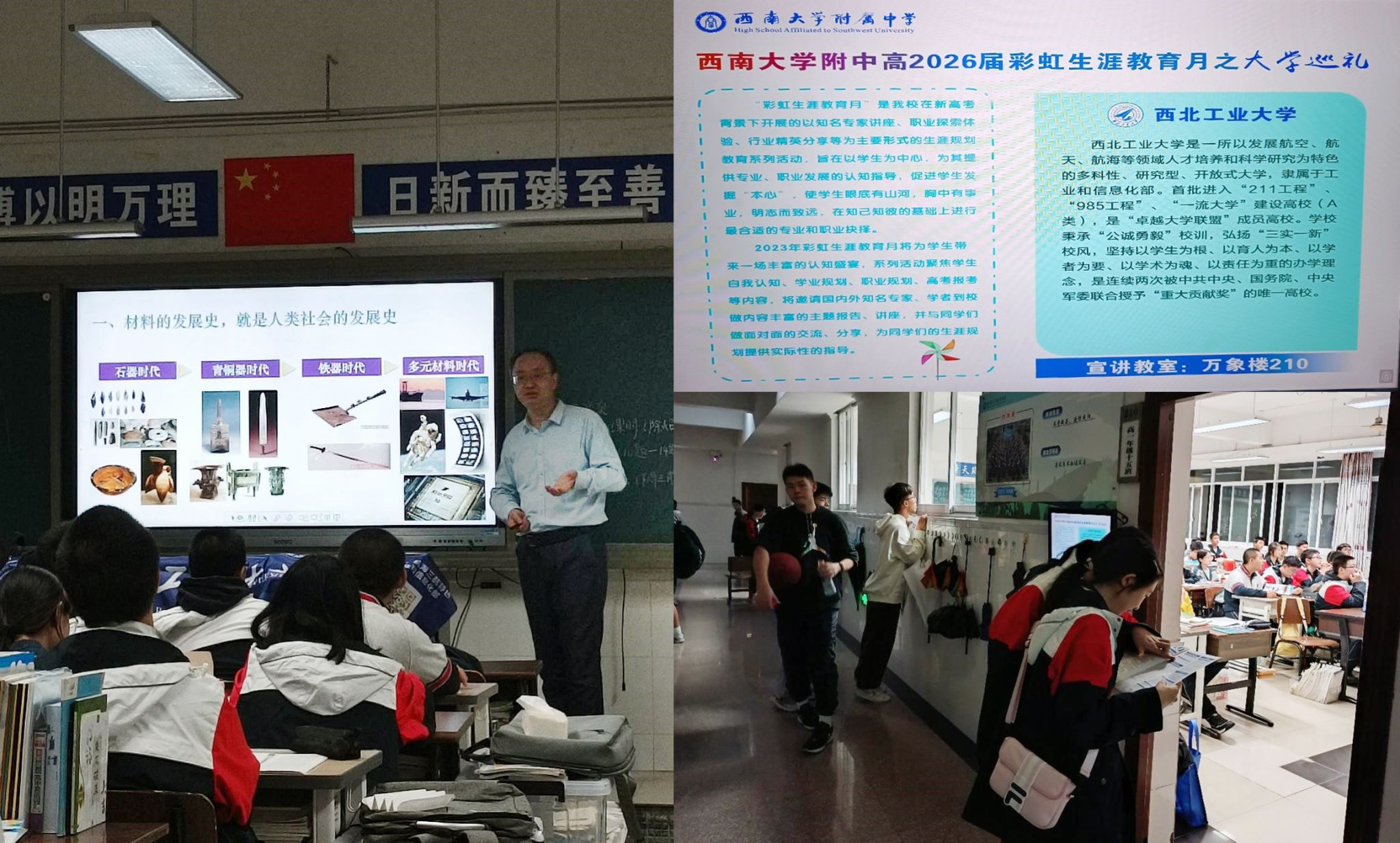 11月10日,应西南大学附中邀请,材料学院王永欣副院长、香香腐宅 重庆招生组王振海老师前往重庆市西大附中参加高2026届彩虹生涯教育月大学巡礼活动并开展科普讲座等招生宣传工作。